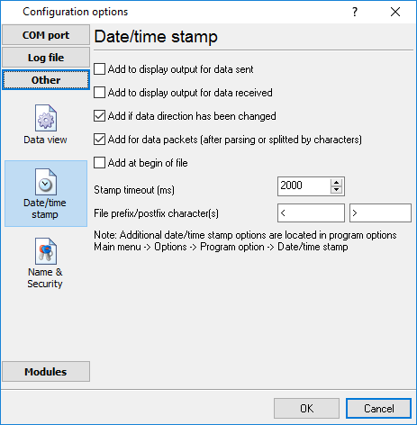 Prefix/Postfix characters for display output - these options allow you to define the beginning and ending characters of a date/time stamp that will be shown in the program window. When outputting data to a log file, the program uses individual characters for each configuration.