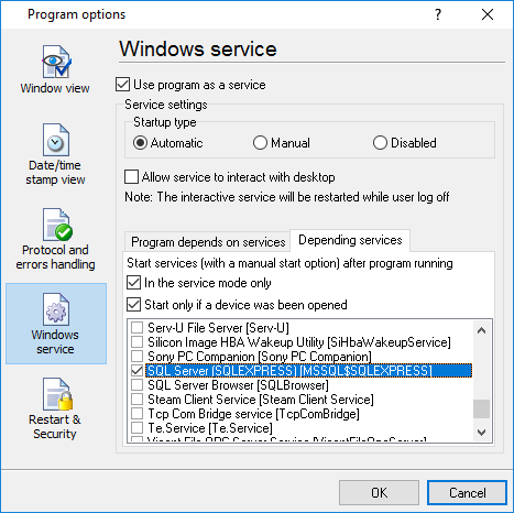 If you want to use the program as a service application, then, please, go to the "Options → Program options → Windows service" tab (fig. 25), then enable the "Use program as a service" checkbox. Later, please, specify the start-up type of the service. There are the following variants: