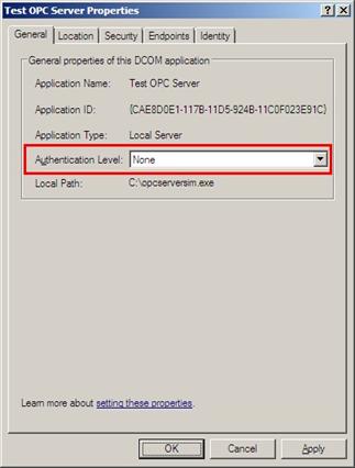 This example shows how to specify the properties for the test OPC server "Test OPC Server". You can specify the DCOM properties using the "dcomcnfg" service command.